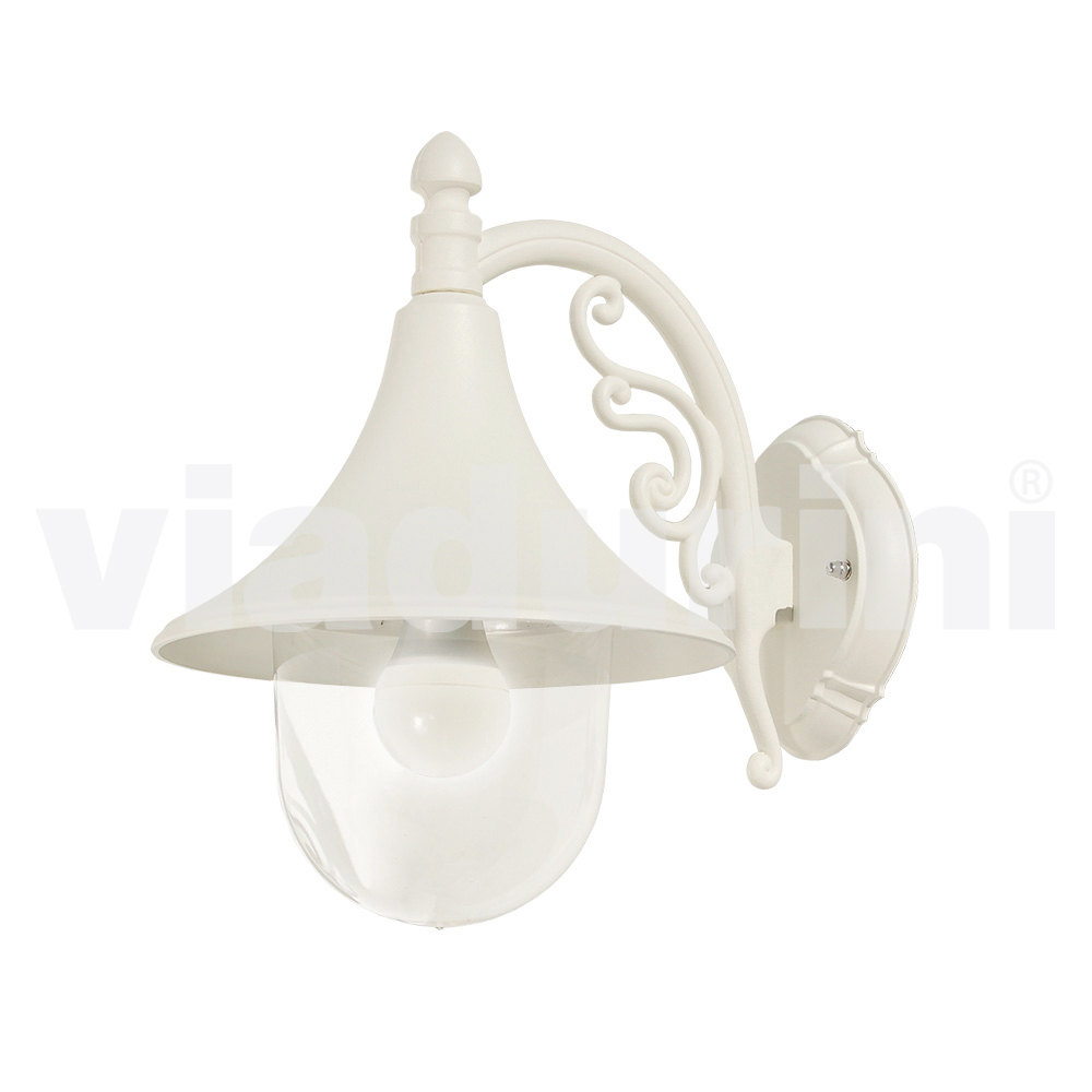 Wall garden lantern in white aluminum made in Italy, Anusca Anusca is a refined outdoor relative lamp handmade in Italy with high quality material: die-cast aluminum structure and polycarbonate diffuser available in the following variants: transparent (guarantees optimal and always homogeneous diffusion of light); opal and smoky.