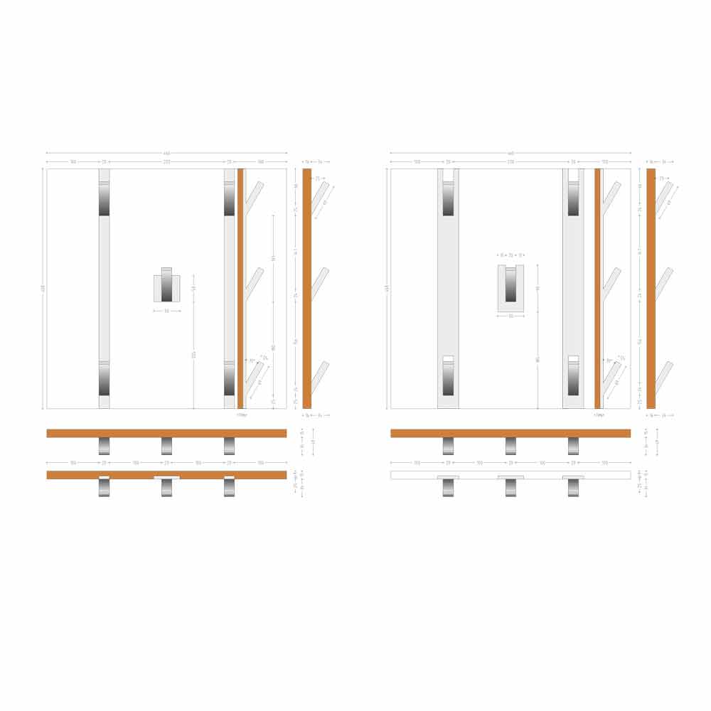 This teak wood wall panel with 5 white corian hangers constitutes a wall hanger with an essential and modern design.