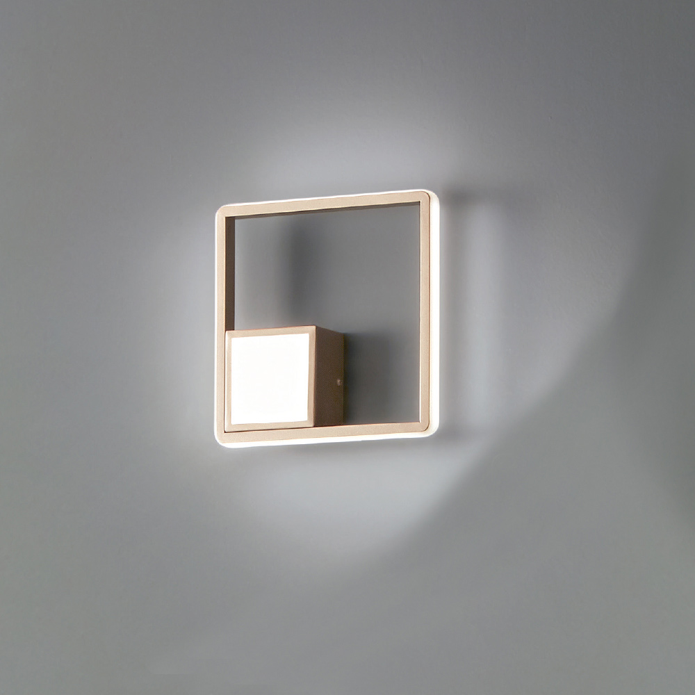 Modern wall light made of gold finish painted metal complete with integrated dimmable LED source . A modern complement whose aesthetics are marked by simple shapes and squared lines , conceived and designed to illuminate and furnish domestic spaces such as entrances, corridors, bedrooms, living areas or kitchens in an exclusive and elegant way. The refined golden finish underlines its refined design and makes it a one-of-a-kind product for a result suitable for those seeking aesthetic perfection of geometric shapes even in their home furnishings. Its peculiarity is the quality lighting that runs through the entire structure thanks to the LED strip enclosed within the structure which makes it perfect for obtaining excellent light output .