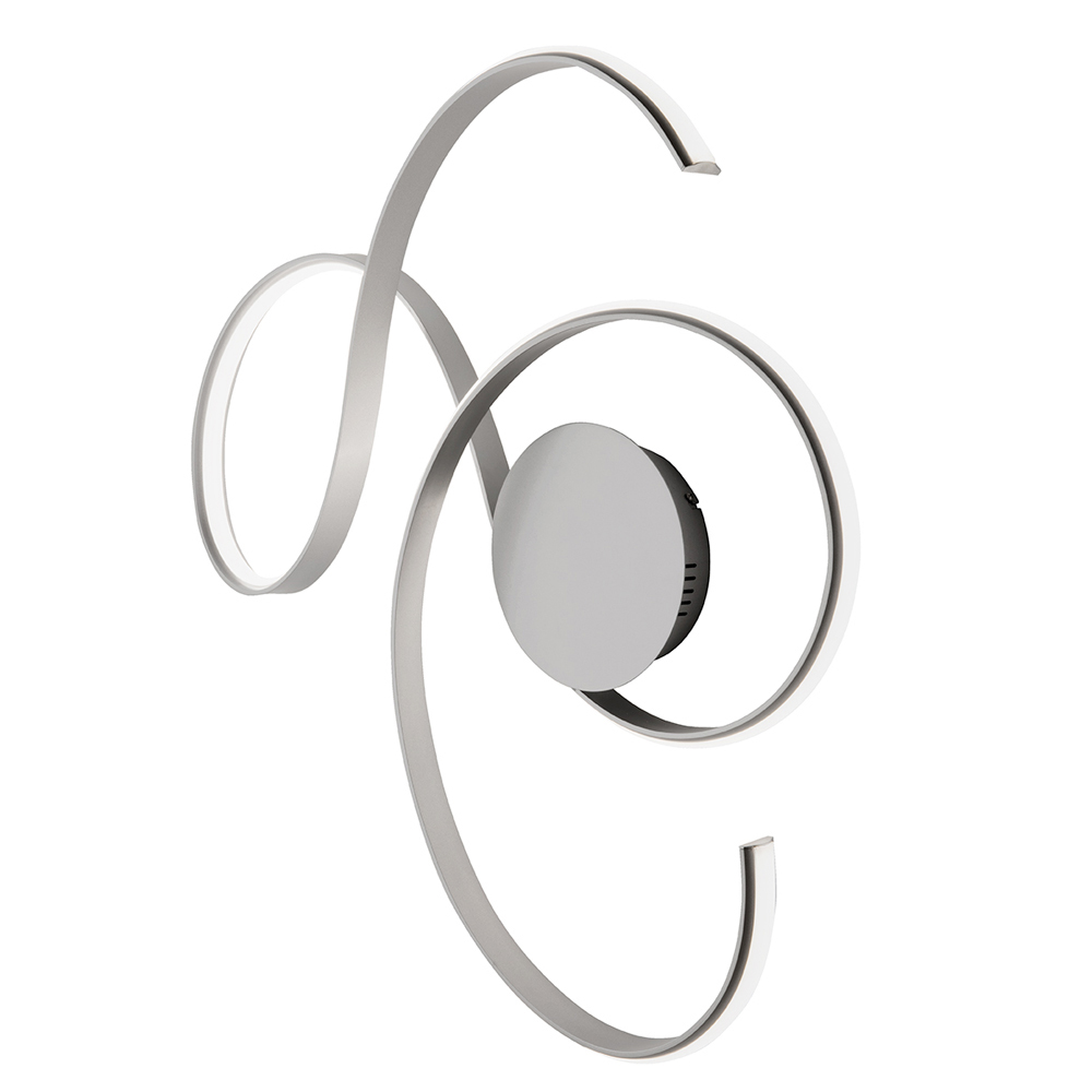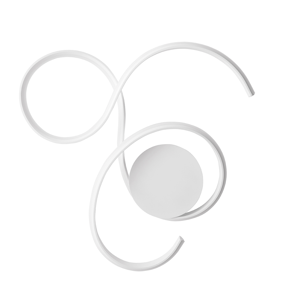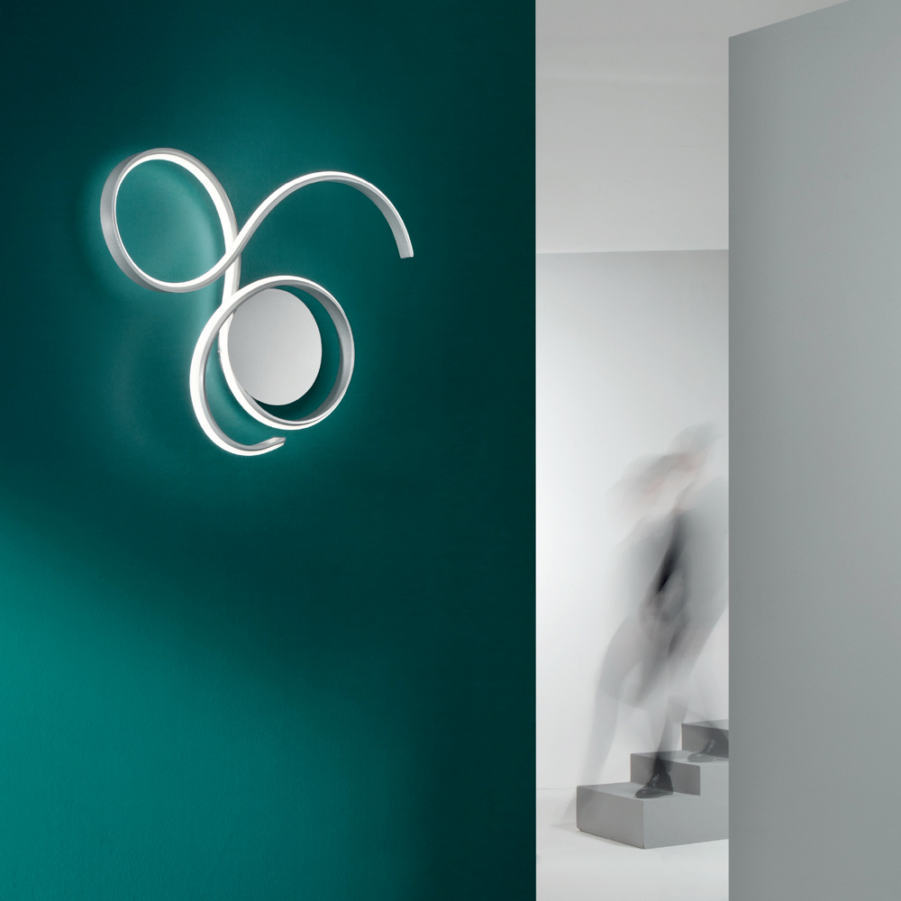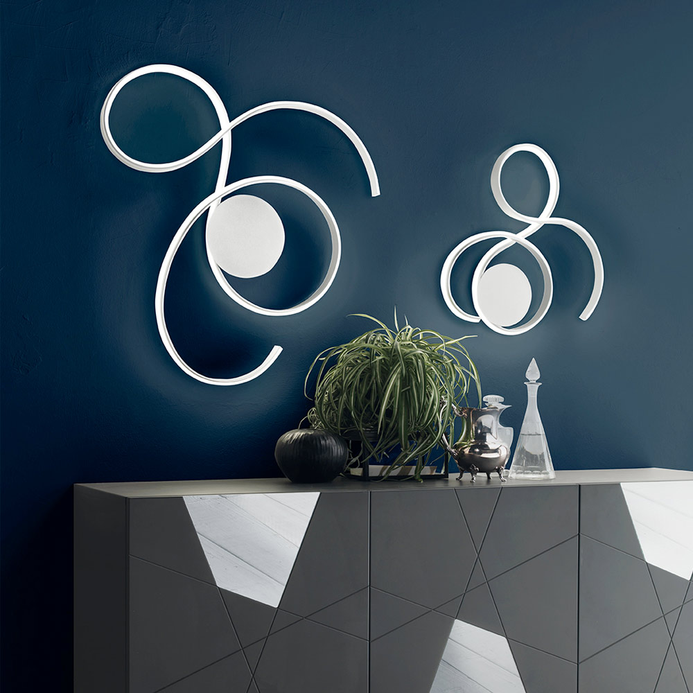 Wall lamp in painted metal complete with integrated dimmable LED source . Sinuous lines and original shapes give life to this modern furnishing accessory that enchants the sight and illuminates every domestic space with a touch of creativity and elegance . A unique and unmistakable design capable of filling the walls of your home through the use of harmonious curves and exclusive plays of light for quality and particularly warm and welcoming lighting. Ideal for giving light to entrances, living areas, bedrooms or kitchens, this lamp shows a strong contemporary personality and, thanks to the dimmable power driver positioned inside the central plate, allows you to adjust the luminous flux for a highly customizable result . Its shape also allows it to be installed on the ceiling like a classic ceiling light, making it even more eclectic and versatile .