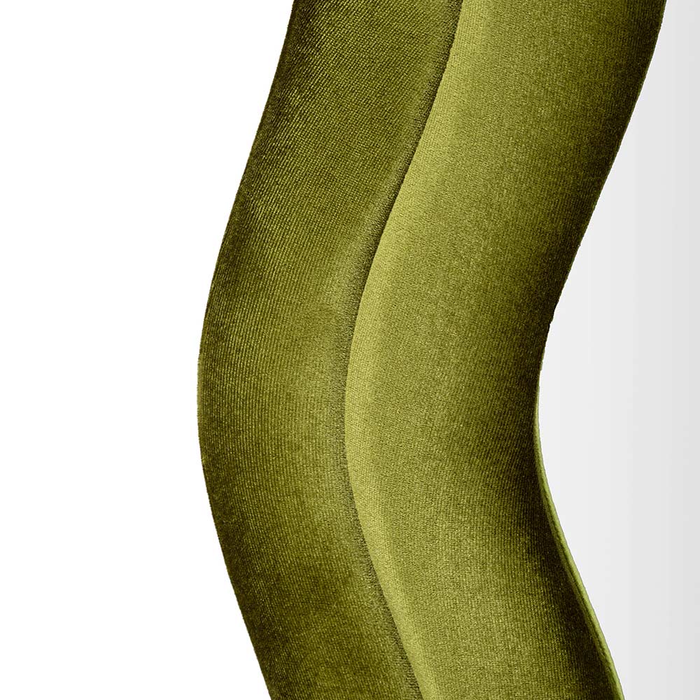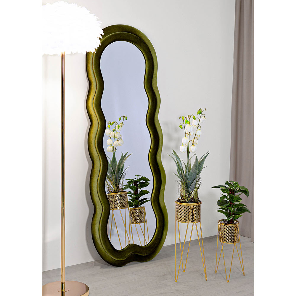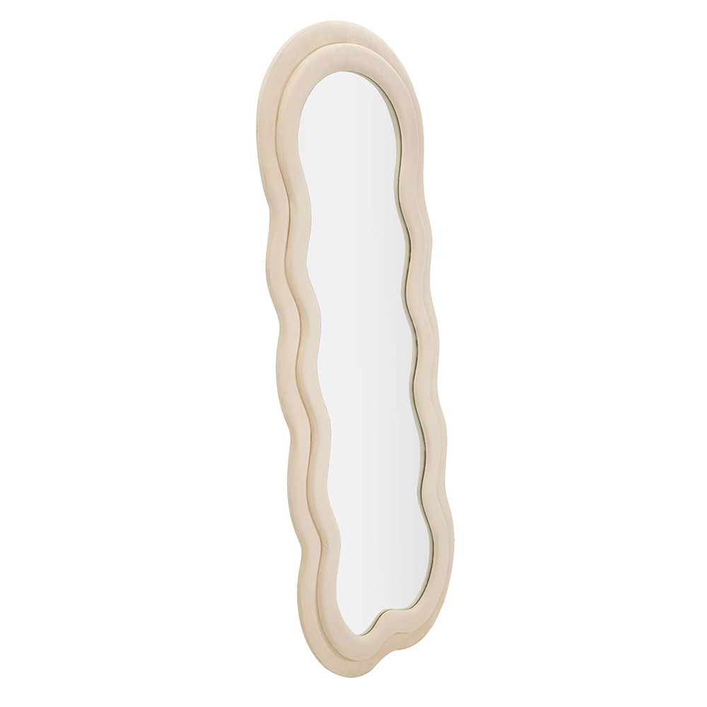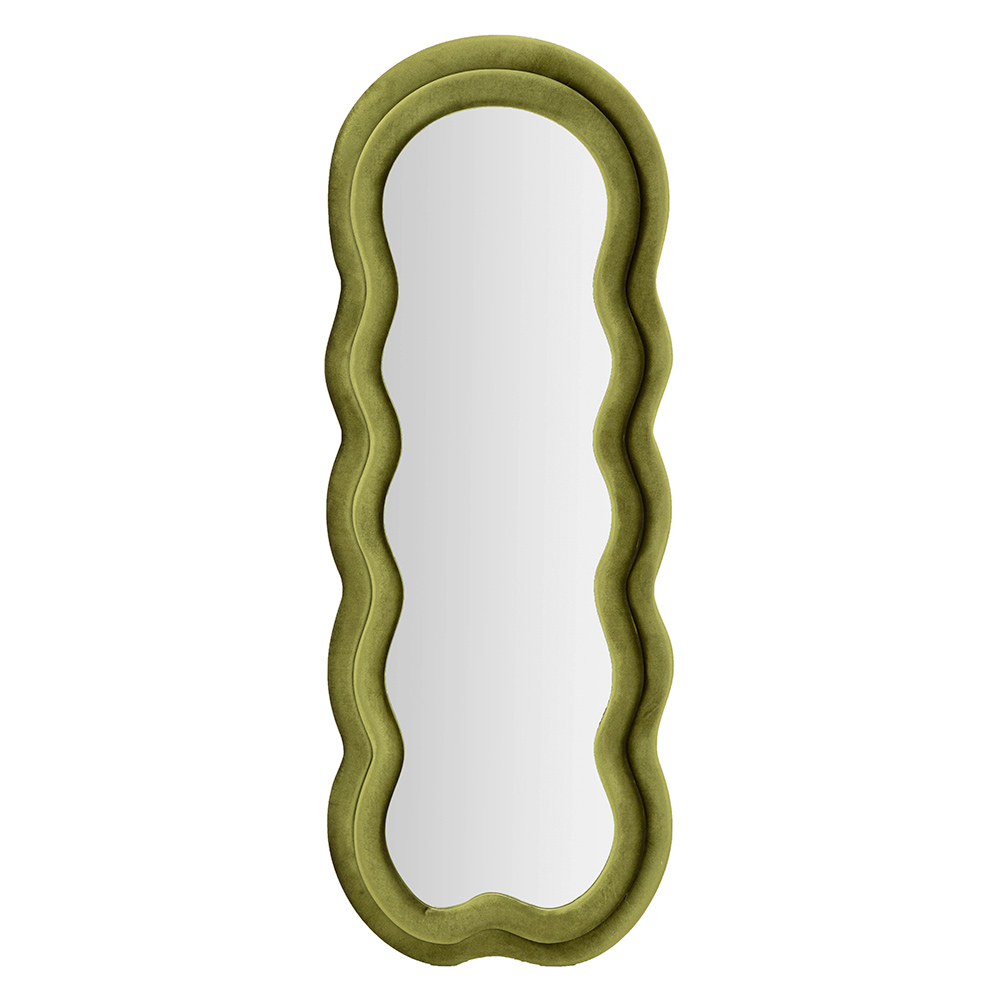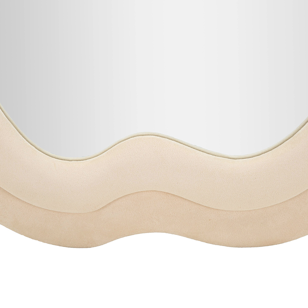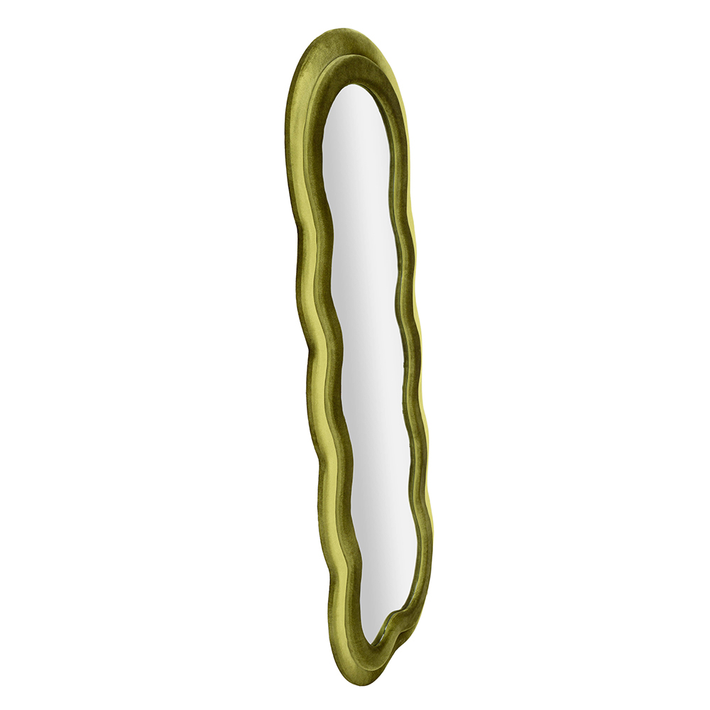 This decorative mirror is a sublime example of how furniture can combine functionality and artistic beauty . With its wavy frame and sinuous lines, this piece speaks a language of fluid elegance and modern design . The velvet finish enhances its organic shape, making it a perfect complement to colored or neutral walls, capable of harmonizing with a wide range of palettes.