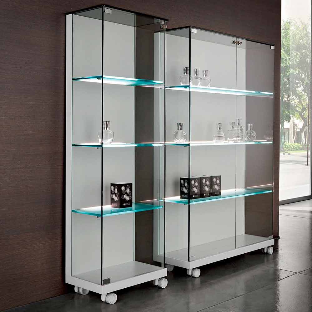 The two-door display cabinet with wheels to facilitate movement is made of transparent tempered glass and a structure in matt white lacquered wood.