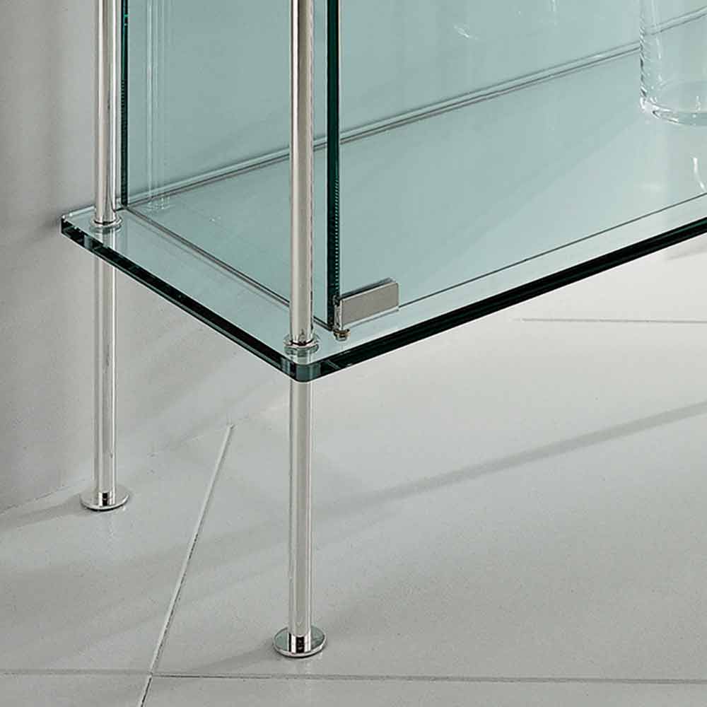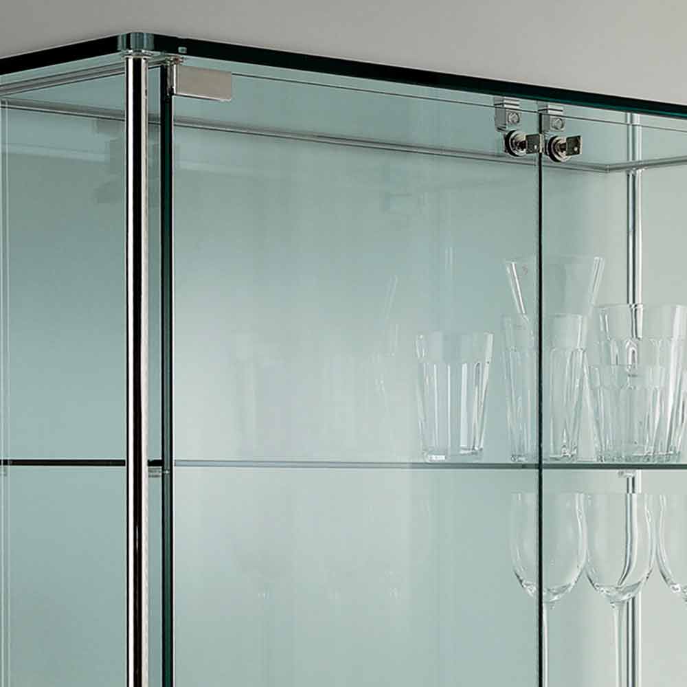 The two-door display cabinet is made entirely of transparent tempered glass with stainless steel metal closure and supports.