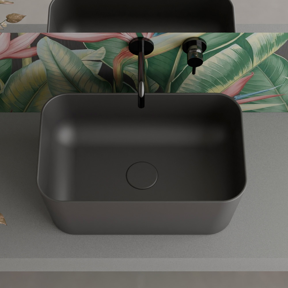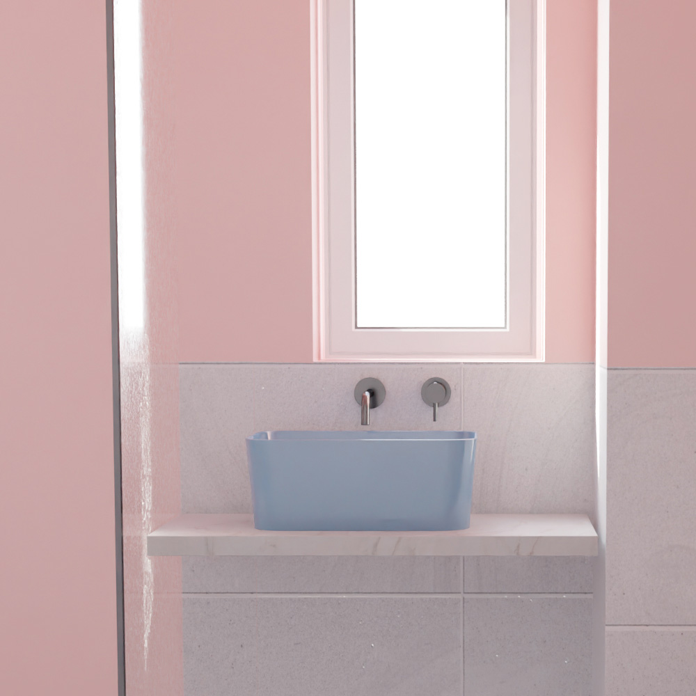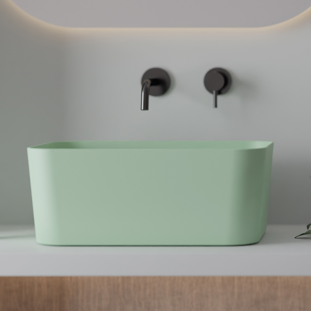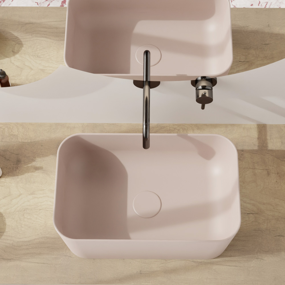 This ceramic countertop washbasin stands out for its geometric and clean design , a rectangular shape with rounded edges that adds a touch of modernity to every bathroom . The available shades are both refined and relaxing, evoking the tranquility of natural and minimalist environments.