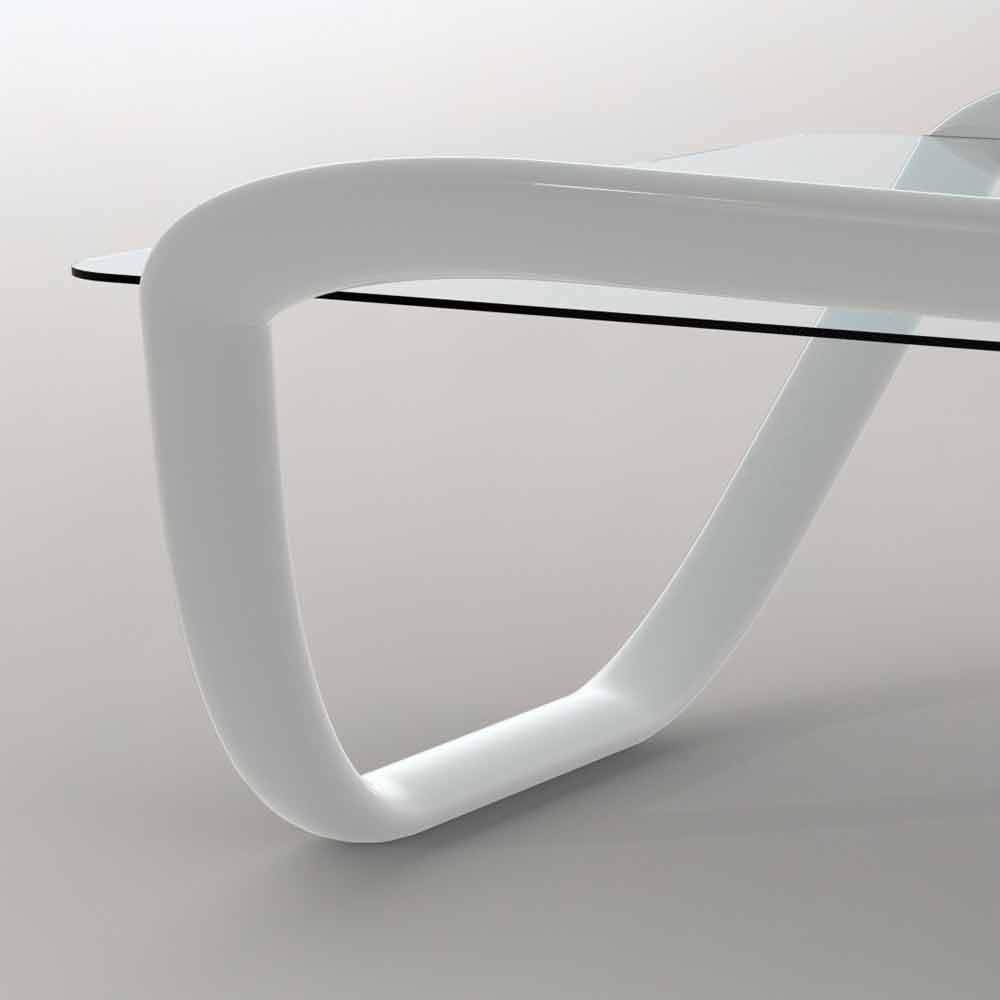 Coffee table made with Solid Surface structure; for a proposal characterized by the simple and suggestive sign of a sinuous continuous line. An essential formal solution, able to personalize the environment. The transparency of the glass top allows to emphasize the soft lines of the structure. A unique shape in the continuity of space. Featuring a glossy / matte white lacquer finish (RAL9003).