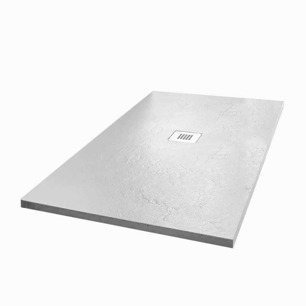 Rectangular shower tray made of white resin characterized by a slate effect texture . Complete with steel grate and drain. Contemporary quality and elegance are the elements that make this product unique, giving the room an extremely innovative classy look. The use of resin and its refined charm give life to a bathroom area full of personality and sophisticated taste without neglecting the fundamental functional aspect increased by the solidity and resistance of the material, which at the same time ensures a non-slip, antibacterial and stain resistant.