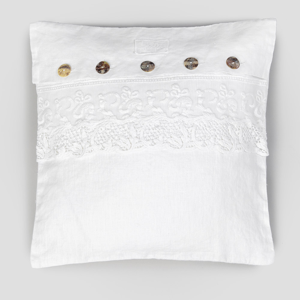 Square pillowcase in pure white linen with Farnese lace or tulle and buttons, luxury design craftsmanship made in Italy.