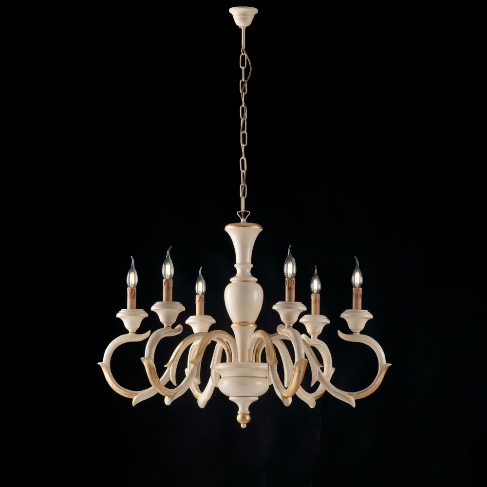 Timeless elegance and expert craftsmanship meet in this classic wooden chandelier, Made in Italy , crafted with care and attention to detail. The harmonious structure, characterized by sinuous arms in a traditional style , gives the room a dramatic and refined elegance.