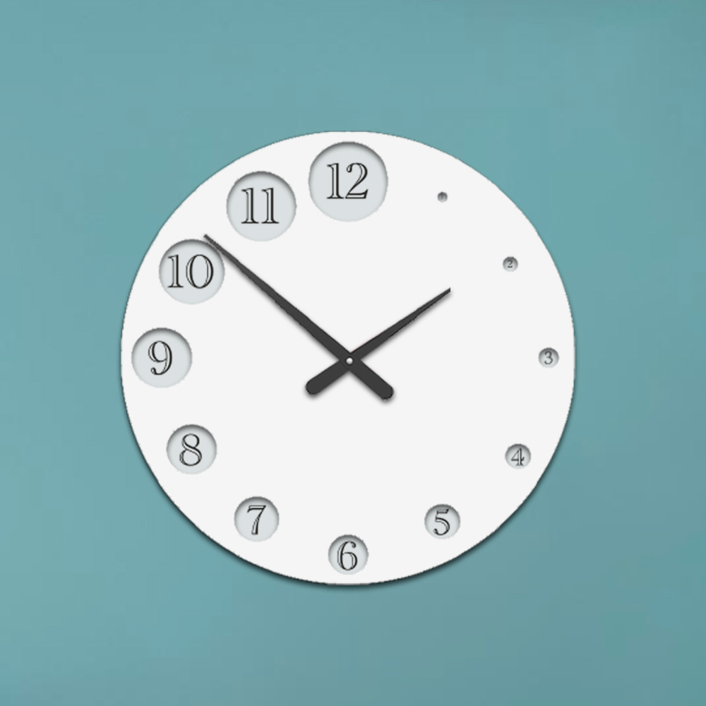 Clock made with a pebble-colored MDF basewith printed numbers, a wooden base above and painted metal hands . A nice visual game arises from the gradual enlargement of the circles that enclose the numbers which give the product movement and an original touch. The finishes make it perfect for completing the furnishing of any daily or contract environment and the materials used for its construction were chosen for their quality and resistance.