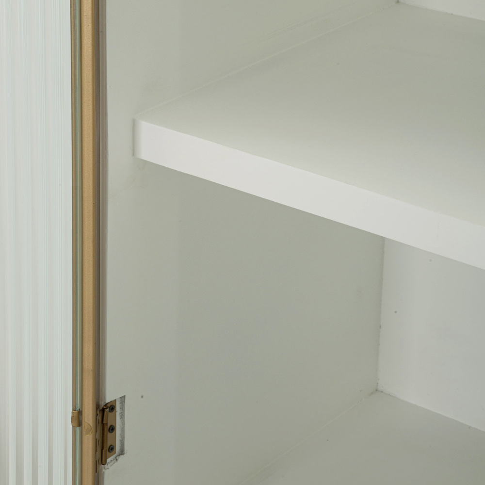 The white finish with vertical grooved details gives a touch of visual texture and depth , while the lines of the base and handles introduce a warm contrast that further elevates the furniture. Its rounded shapes add a unique softness to environments, while offering a generous amount of storage space, organized in a practical way with internal shelves and spacious drawers.